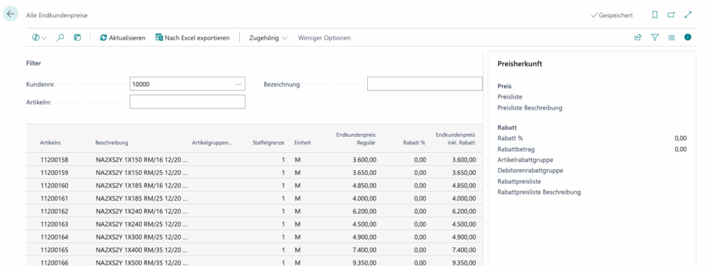 Zeigt sämtliche Artikel mit Preisen für diesen Kunden für den kompletten Überblick
