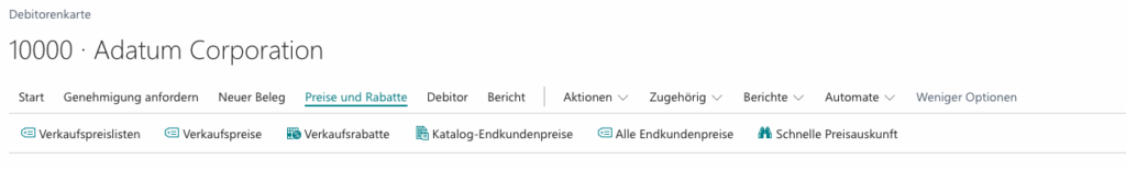 Direkt auf der Debitorenkarte gibt es eine neue Aktion "Schnelle Preisauskunft". Ein Klick und die Endkundenpreisliste öffnet sich mit dem Kunden bereits vorausgefüllt. Der Mitarbeiter tippt einfach eine Artikelnummer oder Beschreibung ein und sieht sofort: