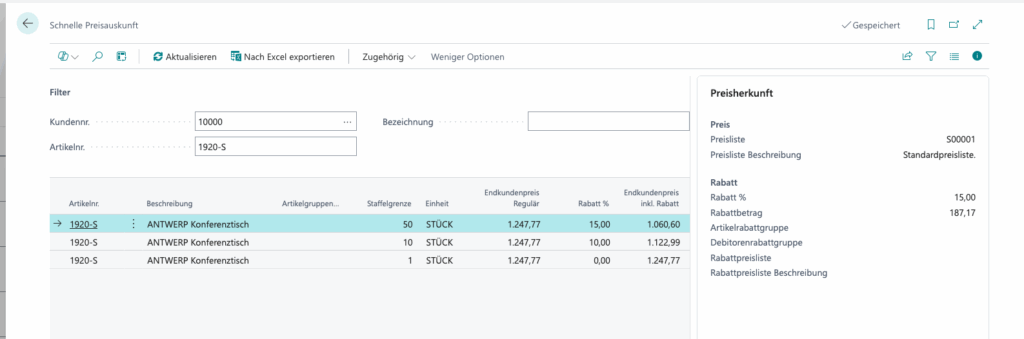 Für den Vertrieb bedeutete das: Um einem Kunden am Telefon den korrekten Endpreis für einen Artikel zu nennen, mussten Mitarbeiter manuell mehrere Preislisten prüfen, Rabattgruppen abgleichen und den tatsächlichen Preis selbst berechnen. Das kostete Zeit, war fehleranfällig und führte zu Unsicherheit bei der Preiskommunikation.