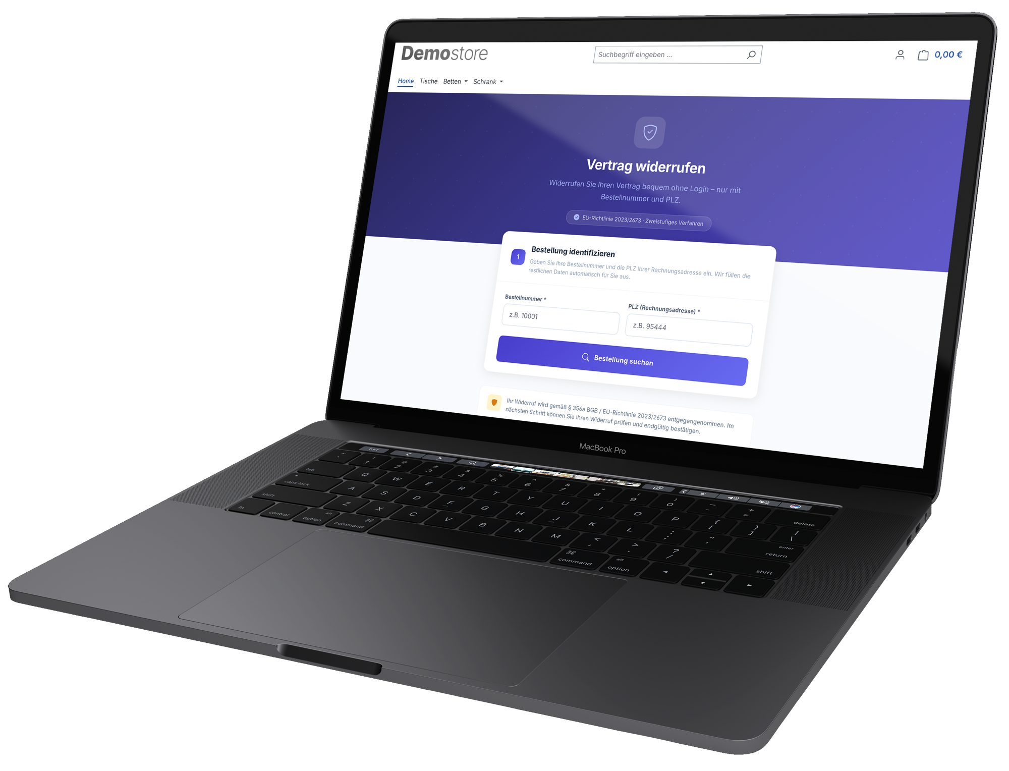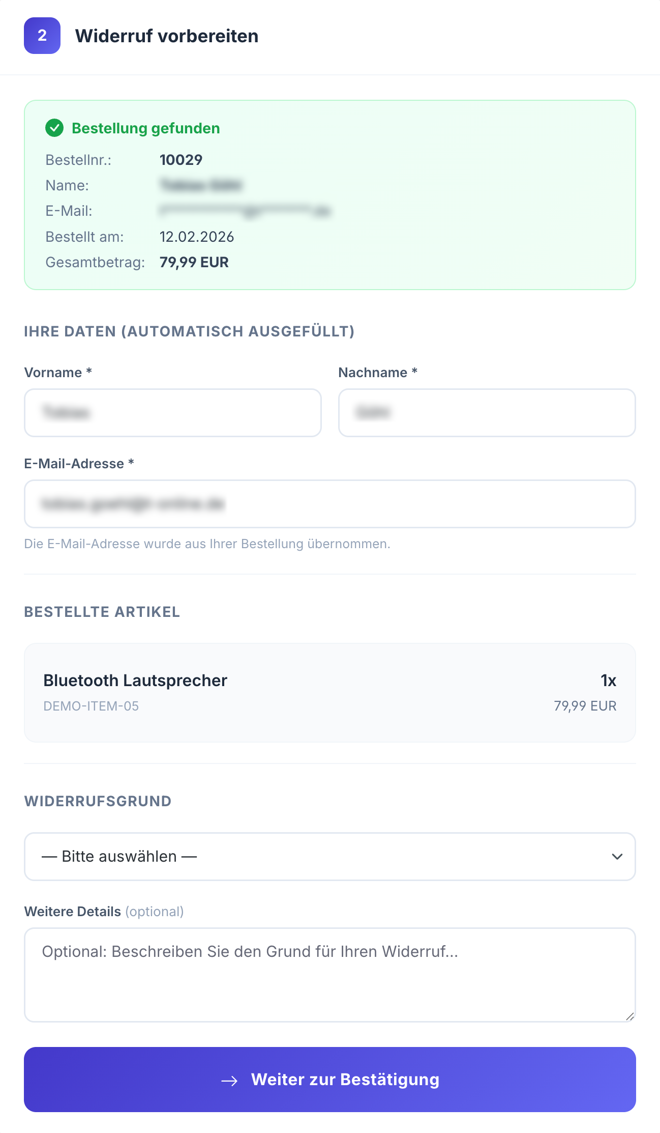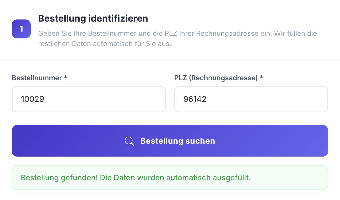Die Identifizierung der zu widerrufenden Bestellung erfolgt über die Bestellnummer und die Postleitzahl der Rechnungsadresse. Alle weiteren Daten werden daraufhin automatisiert ergänzt.