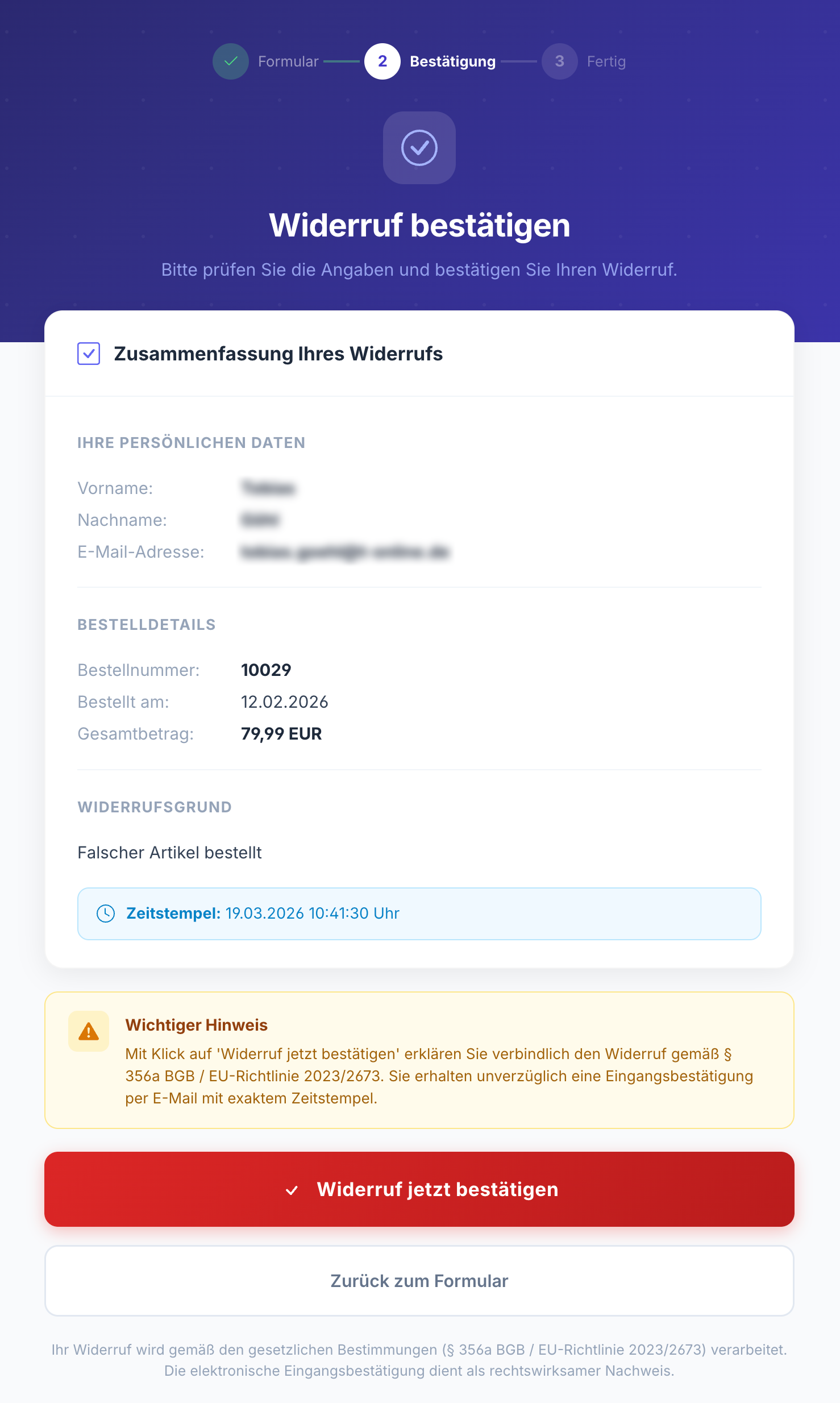 - Der Prozess ist zweistufig und besteht aus Widerruf starten & bestätigen